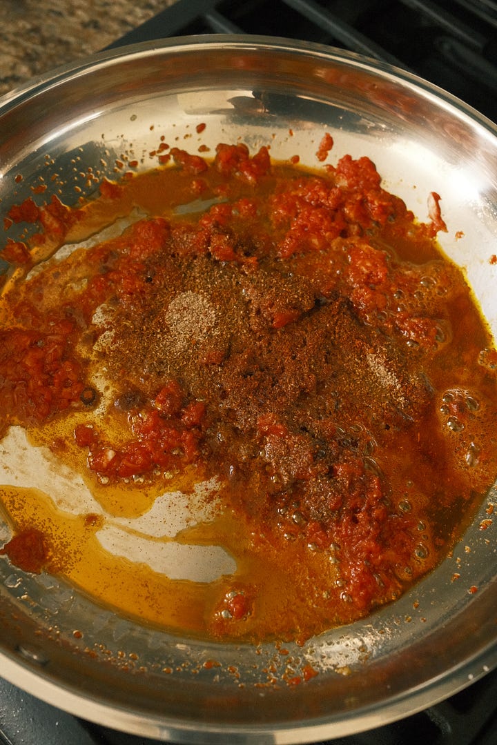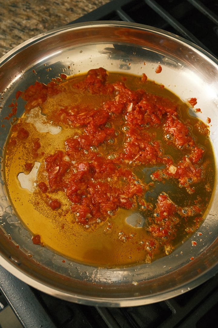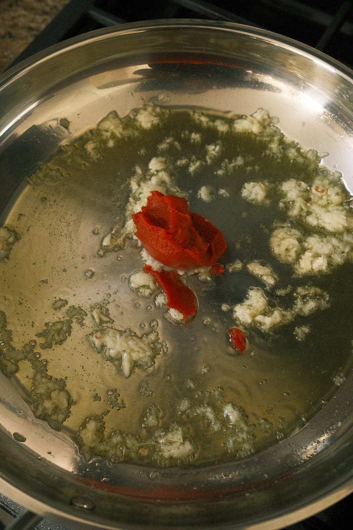 Heat a skillet on high heat then drop to medium. Add the olive oil and allow it to heat up for a minute. Add the garlic and saute on low heat until fragrant. Add the tomato paste, paprika, coriander, and cayenne. Mix well and allow it to cook on low heat for about 3-5 minutes.