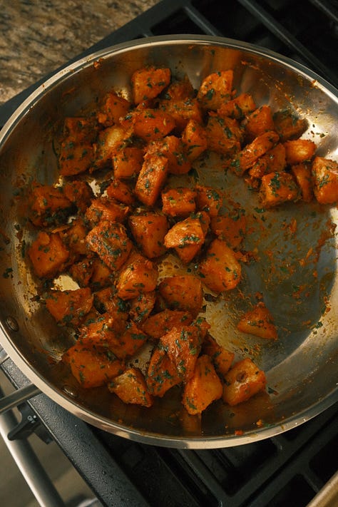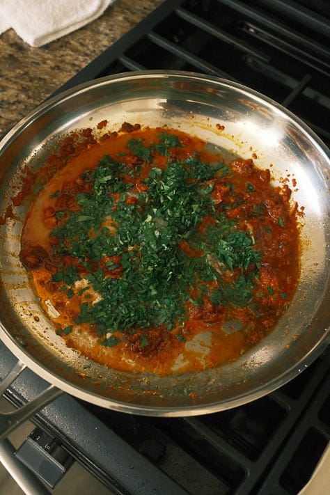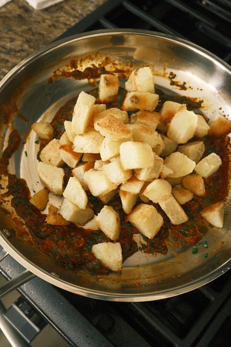 Add the juice of both lemons and half the cilantro and mix for 1 minute. Add the potatoes to the skillet and toss into the sauce really well.