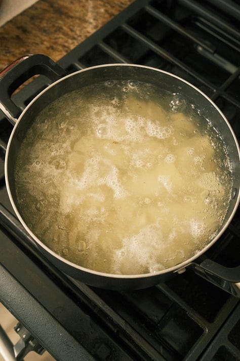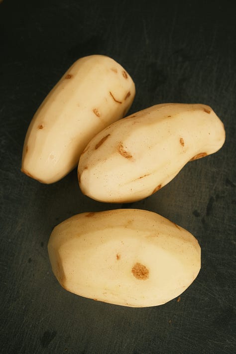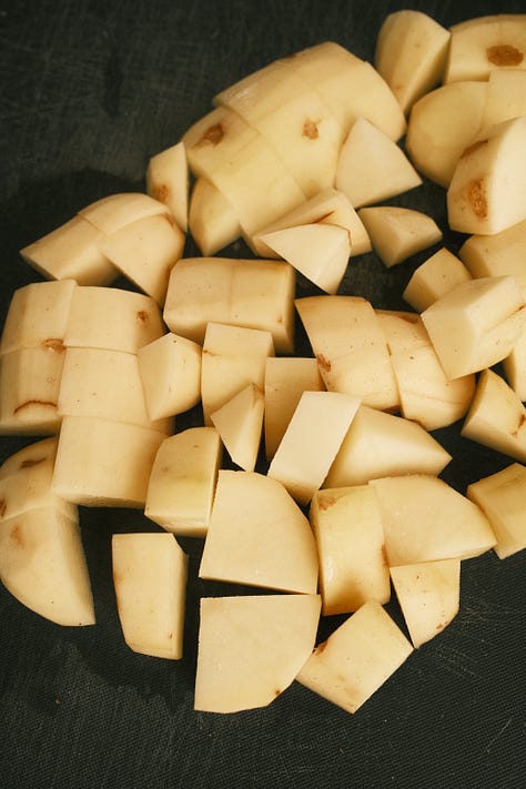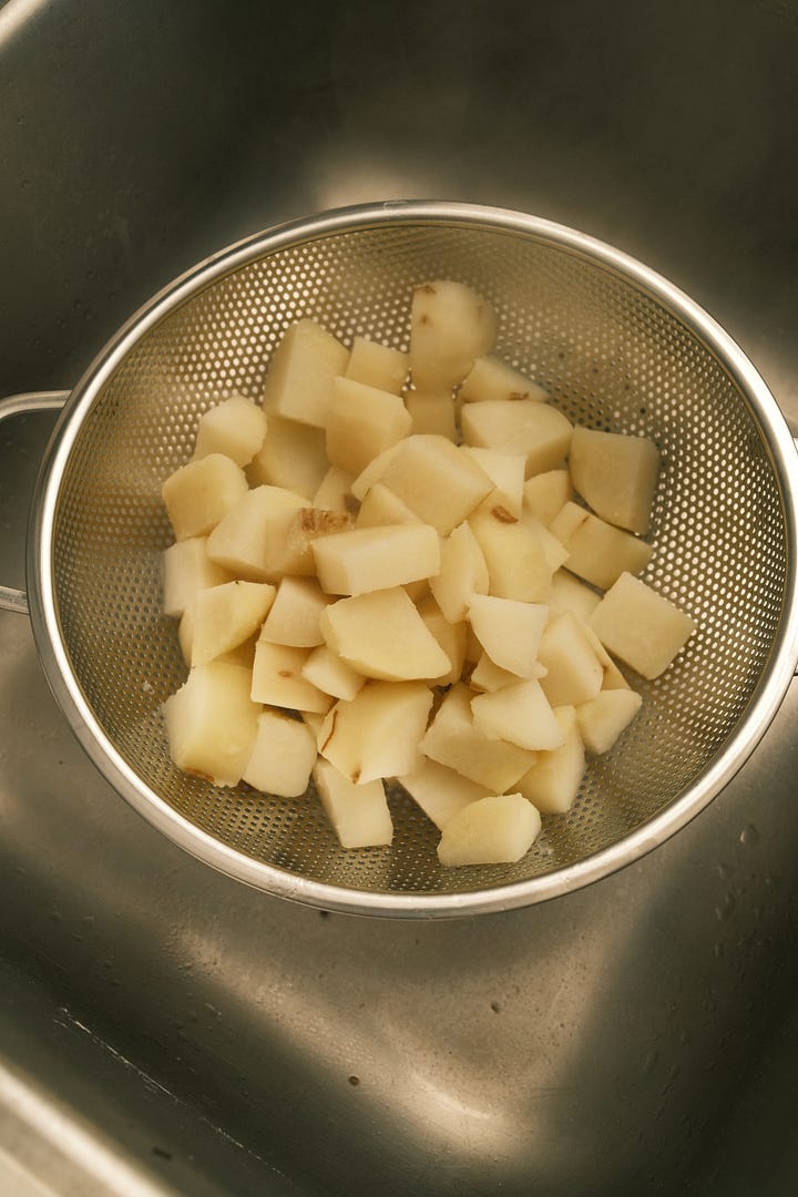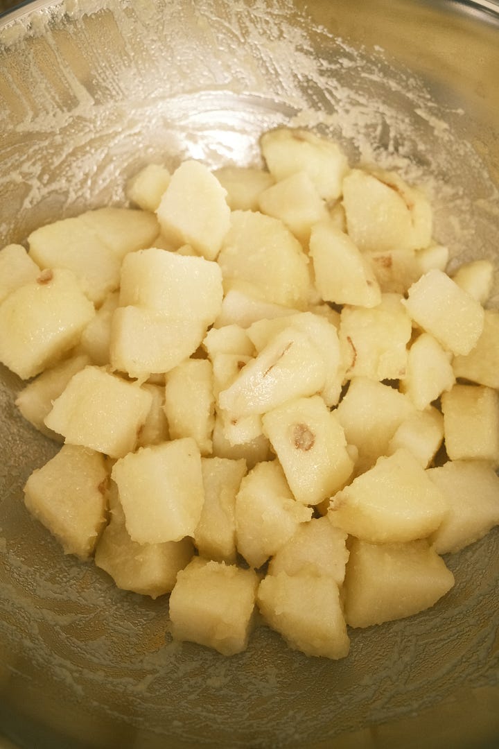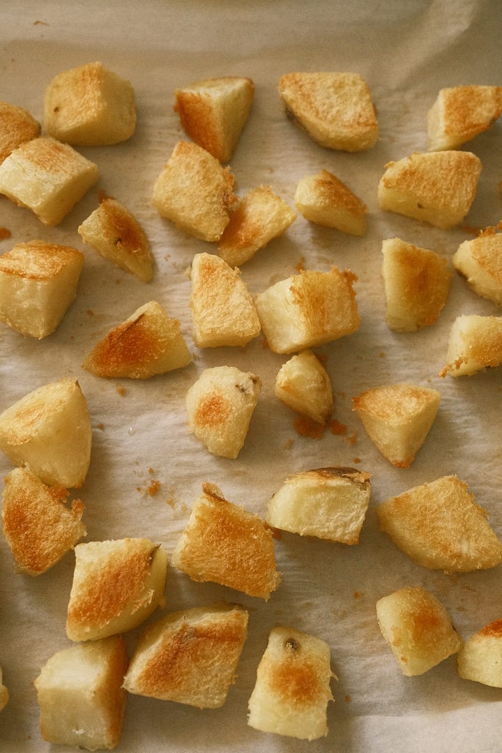 Peel the potato and cut into medium cubes. Place in a pot of boiling water for 5-7 minutes with a tsp of baking soda. Then strain, add to a large mixing bowl, season with salt and olive oil and toss together. Place on a baking tray and into a 450F oven for 30 min flipping halfway through.