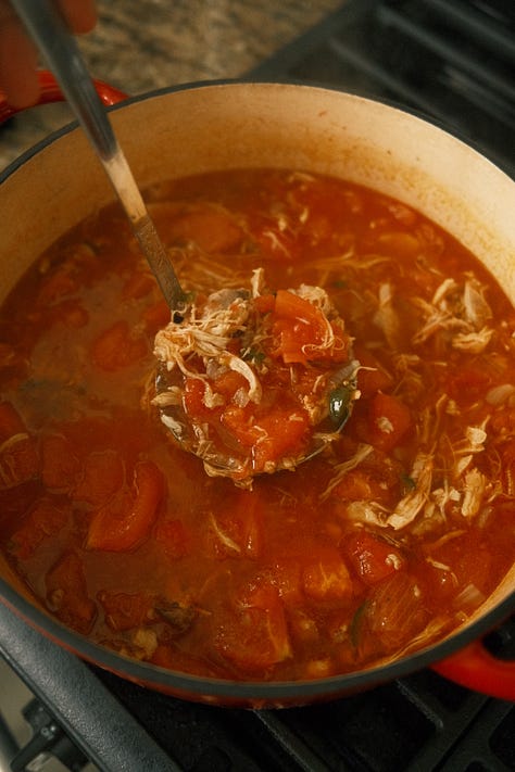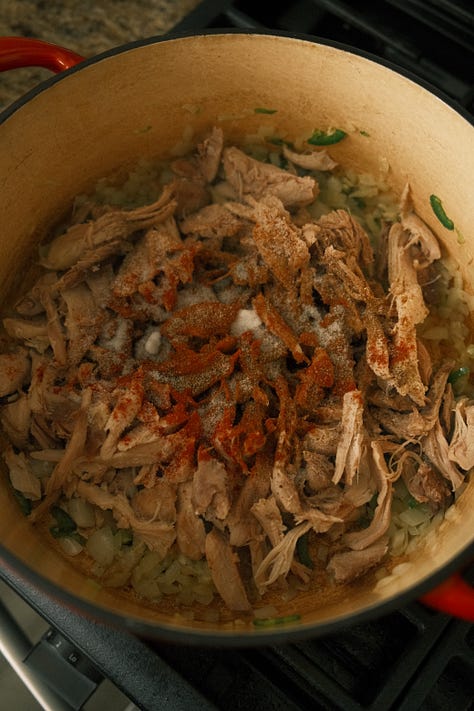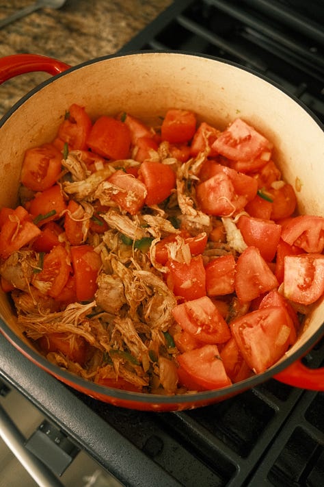 Add the shredded chicken, season with chili powder, cumin, black pepper, cayenne, and salt. Mix well, add the fresh tomato, cover, and simmer for about 10 minutes. Gently press on the tomato to break them down, add about 8 cups of our broth, then cover and simmer for a final 20-30 minutes.