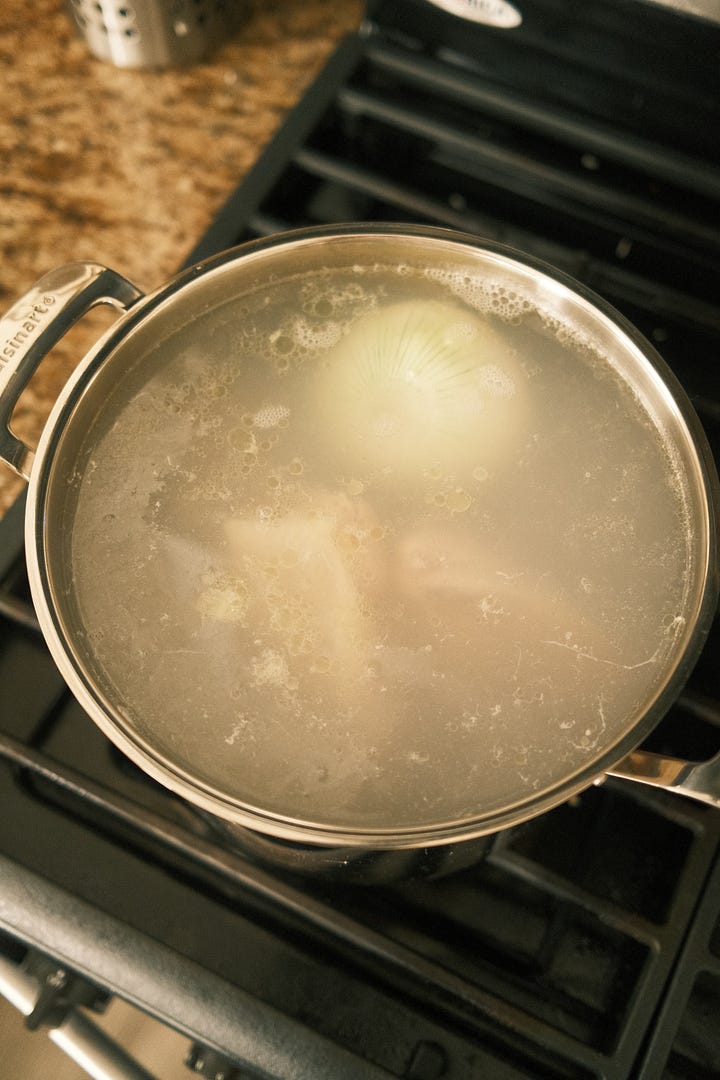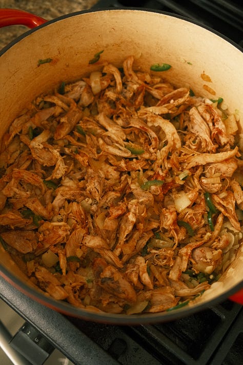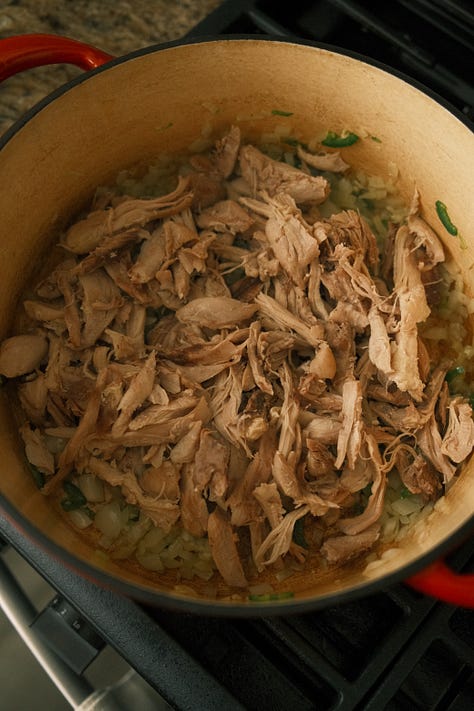 I’m starting this from scratch so to get my shredded chicken, I’m boiling a few chicken thighs with an onion and a few garlic cloves for about 1 hour. Then remove the chicken, allow it to cool, then shred. And strain the onion and garlic cloves out of the broth.