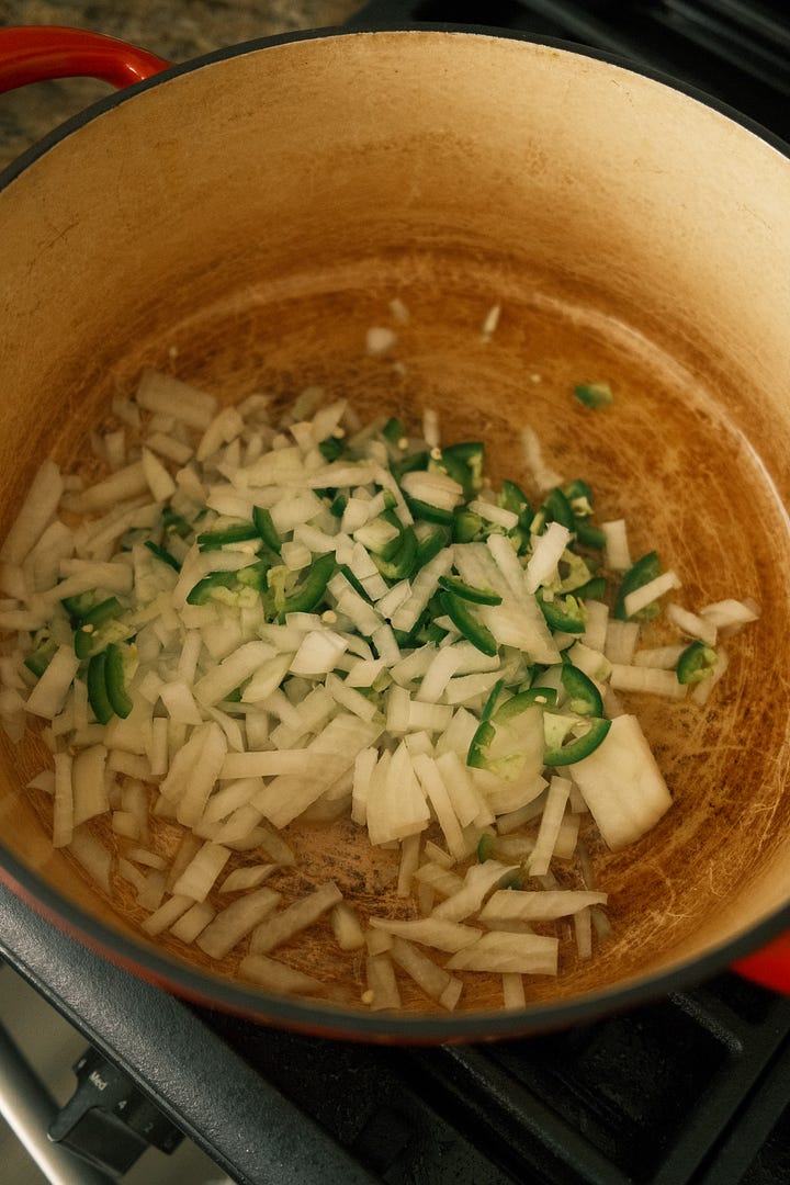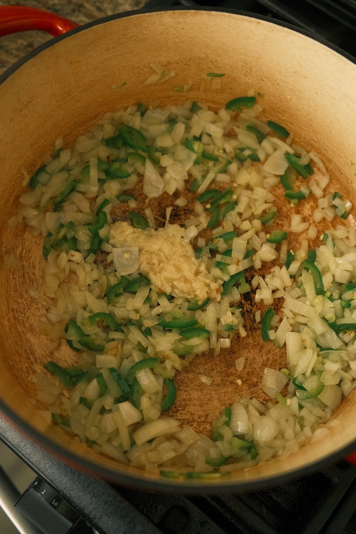 Heat a large heavy bottom pot for a few minutes. Add the olive oil and give it a minute to heat up. Add the diced yellow onion and garlic and saute for a few minutes. Then add the grinded garlic and saute until fragrant.