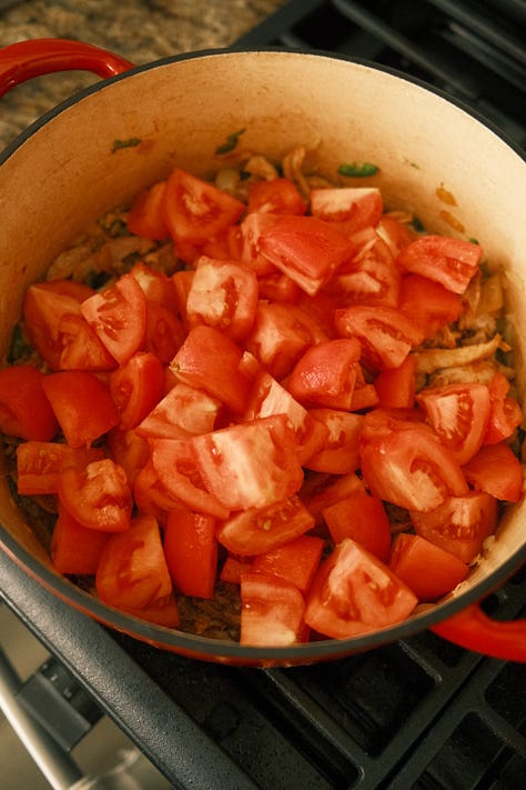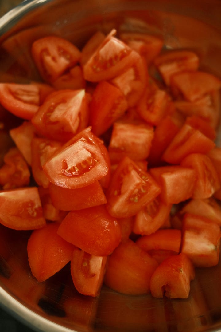 Next I’m scoring the bottom of the roma tomatoes and soaking them in boiling hot water for about 10 minutes. This loosens the skin and makes them easy to peel. Once peeled, cut into medium pieces and set aside.