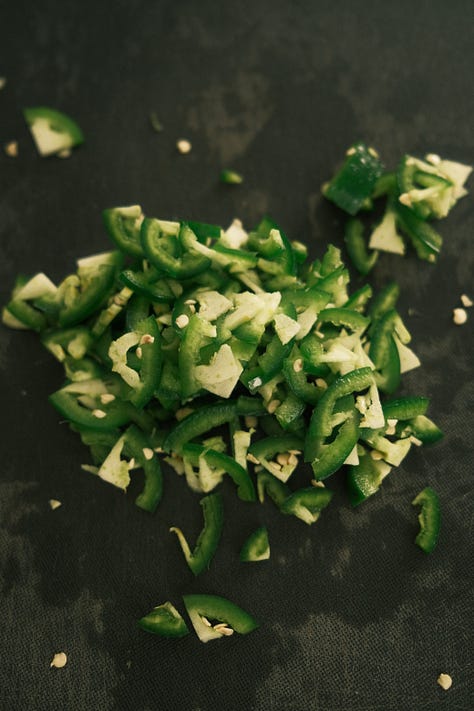 Dice a yellow onion and jalapeno and grind the garlic into a paste. Then set aside.