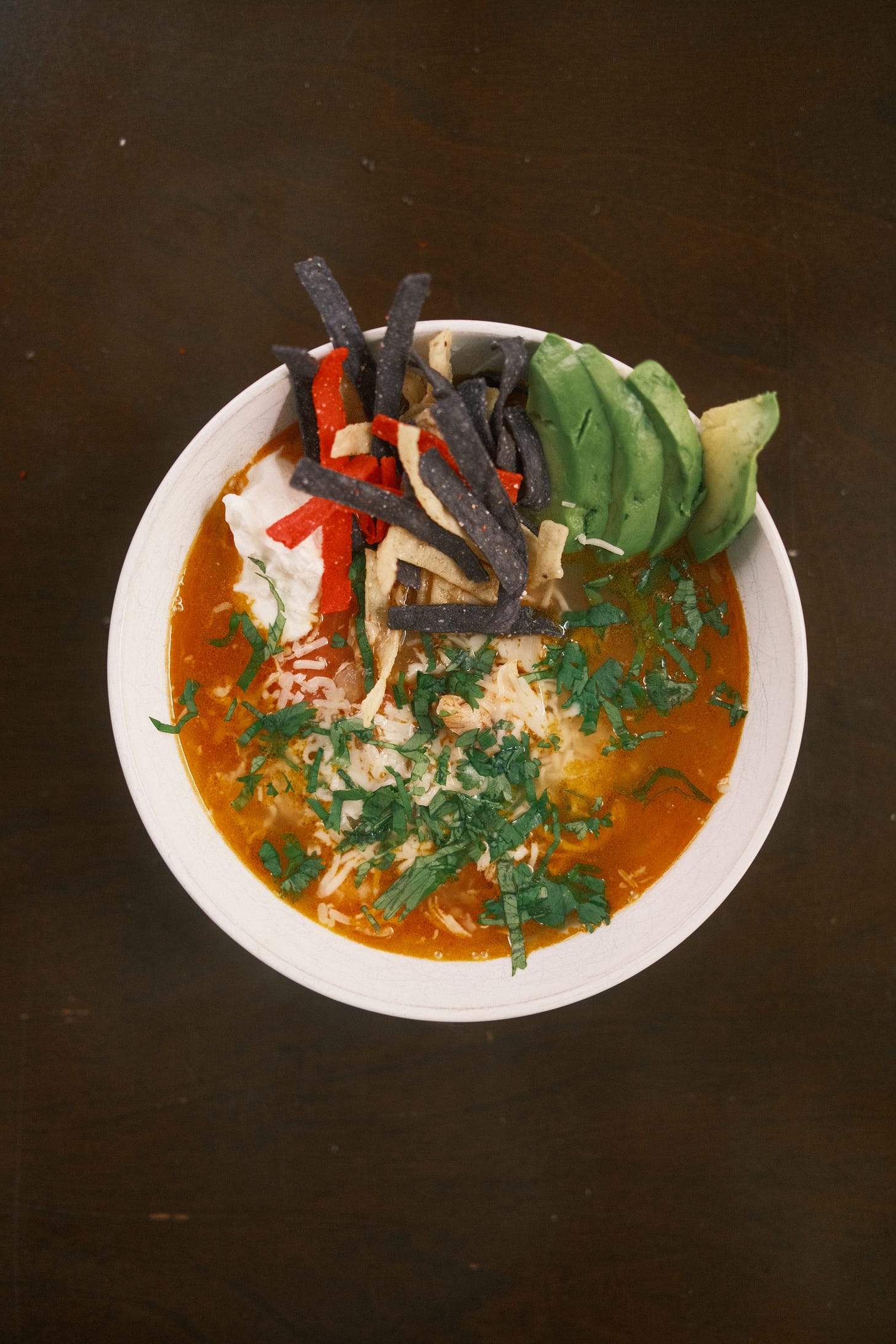 Plate and garnish with fresh cilantro, avocado, shredded cheese, sour cream, and tortilla strips and enjoy.