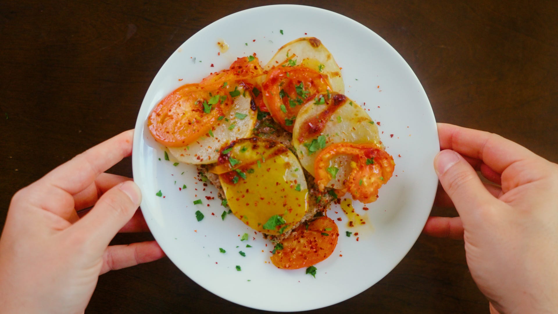 Peel and slice the white potato into quarter inch circles. Slice the tomato into quarter inch circles as well. Place the potato and tomato all over the top, drizzle olive oil all over and into a 400F degree oven for 20 minutes.