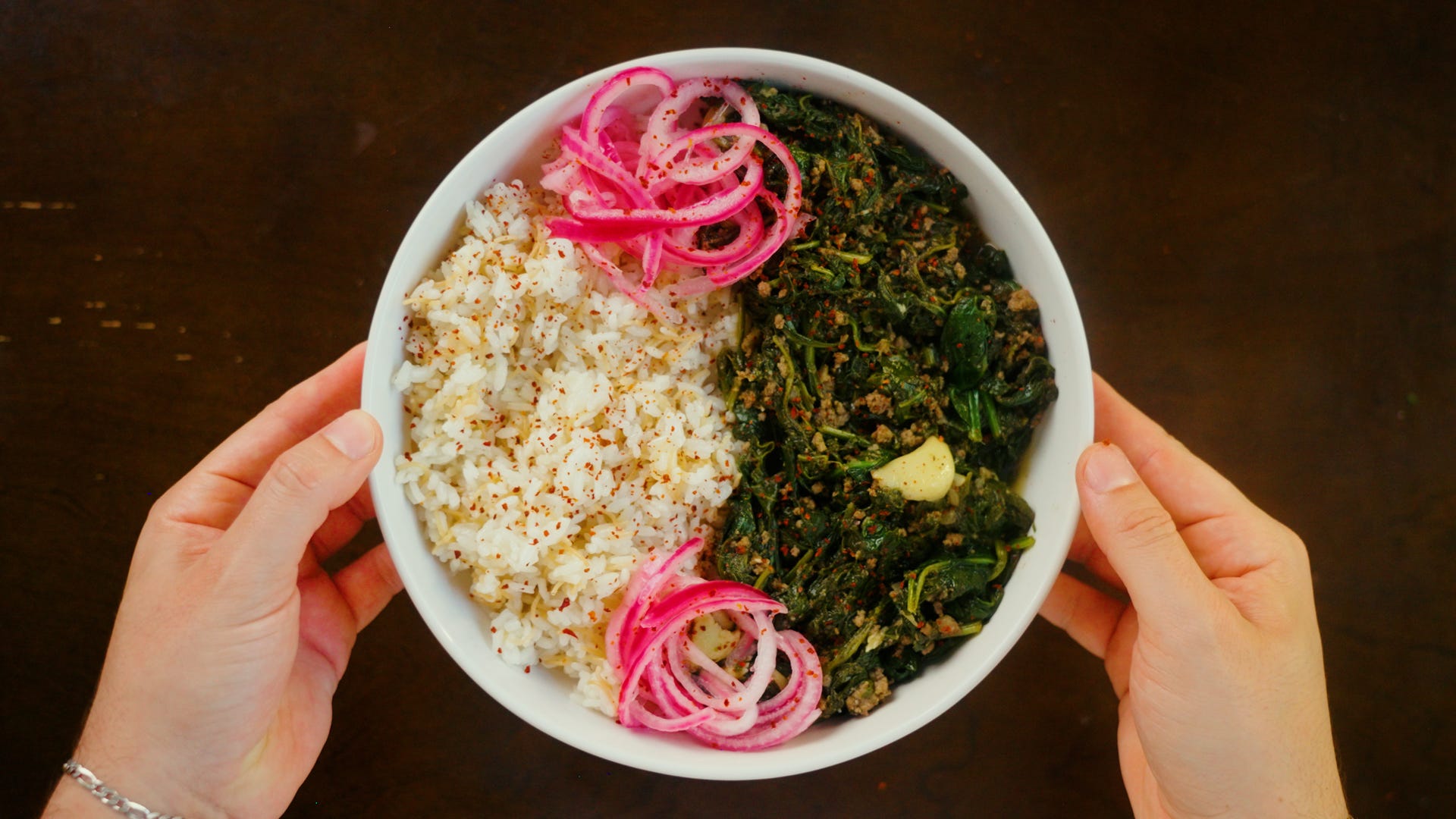 Plate with some vermicelli rice, garnish with Aleppo pepper, pickled red onions, and enjoy.