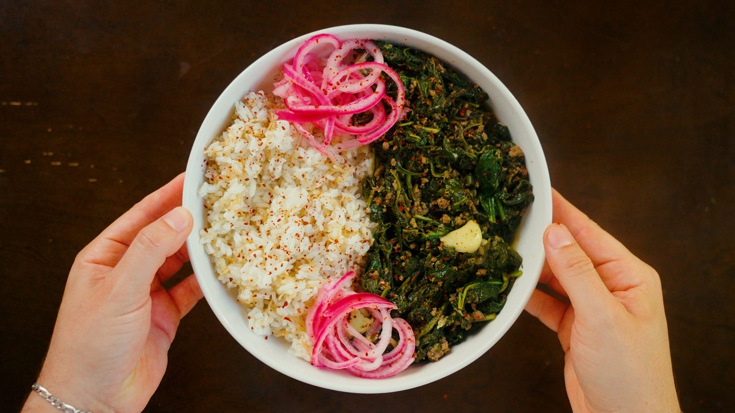 Sabanikh is the Arabic word for spinach and that's exactly what this dish is. Lots and lots of spinach cooked down with plenty of onion, garlic, ground beef, and a nice touch of lemon juice to bring this all together. It's a beautiful and simple dish that really defines a Levantine home. Of course our Lebanese, Syrian, and Jordanian neighbors also share this dish but with their own touch. I highly recommend this one, I actually make this for myself quite often because it's easy and a healthy option to throw together.