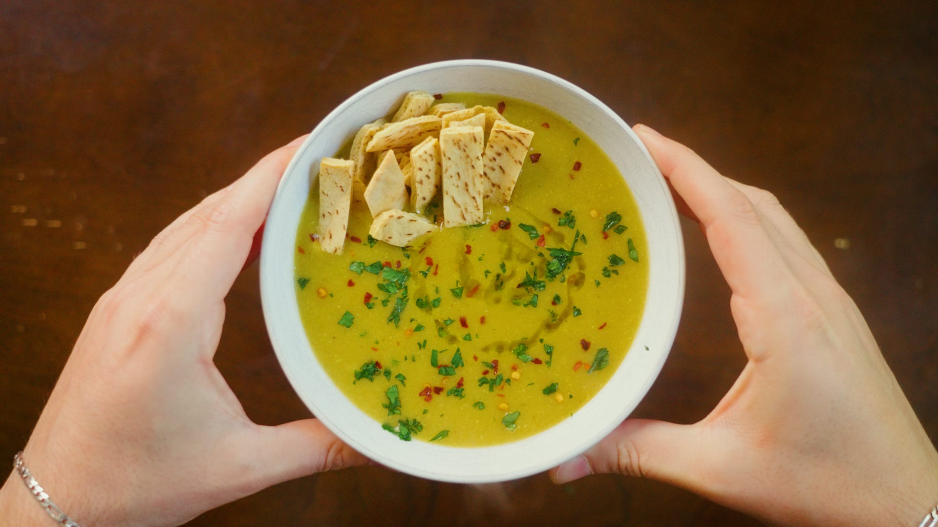Plate and garnish the soup with red pepper, parsley, a drizzle of olive oil, pita chips, and lemon juice and enjoy!