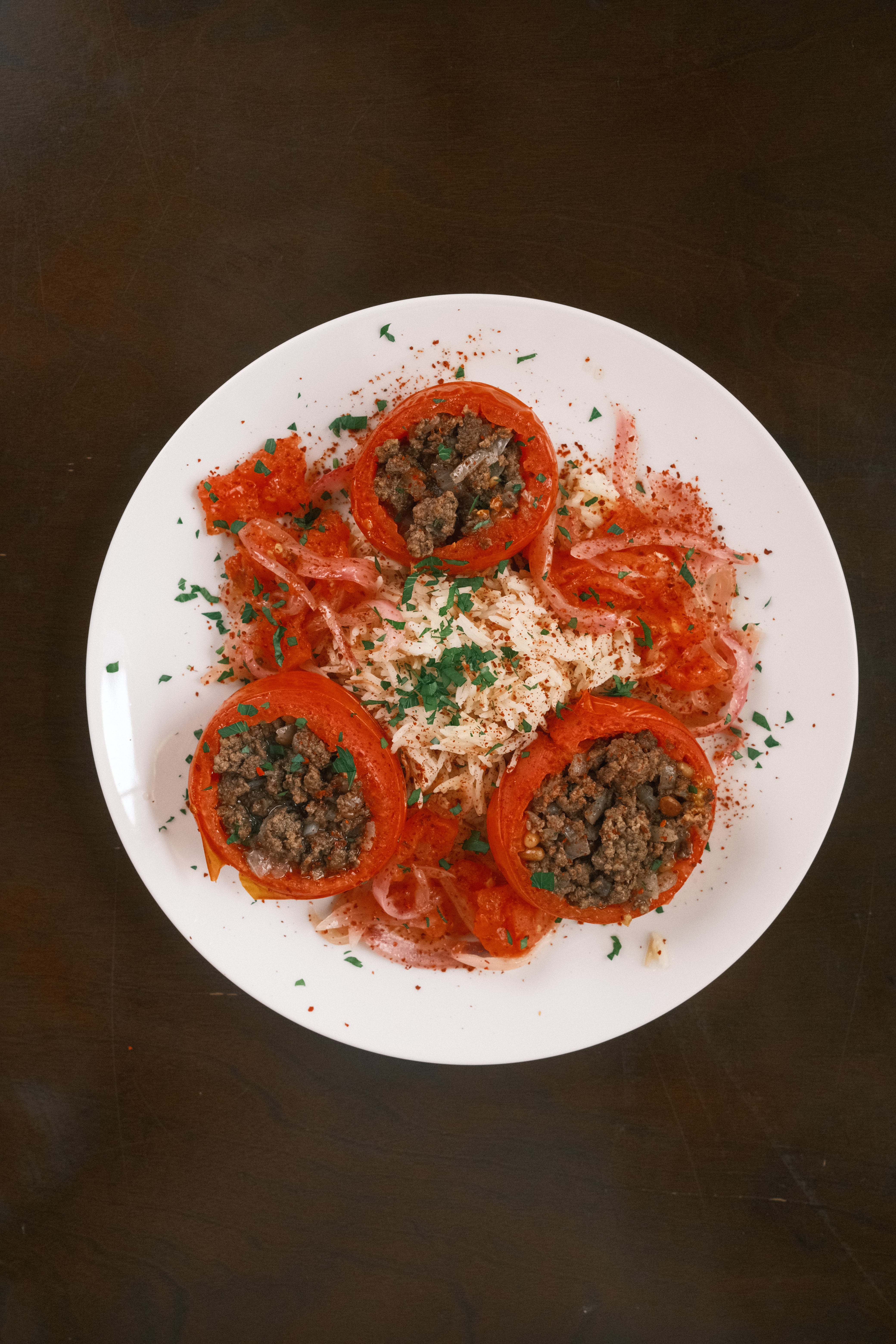 Of all the vegetables to stuff, tomatoes have to be the easiest and my favorite (yes I know tomatoes are fruits but we eat them like veggies so…). I think these are the least labor intensive to stuff because they’re easy to core and they’re already in a bowl like shape so it’s basically asking to be stuffed! Serve this with some rice and you have yourself and incredible meal.