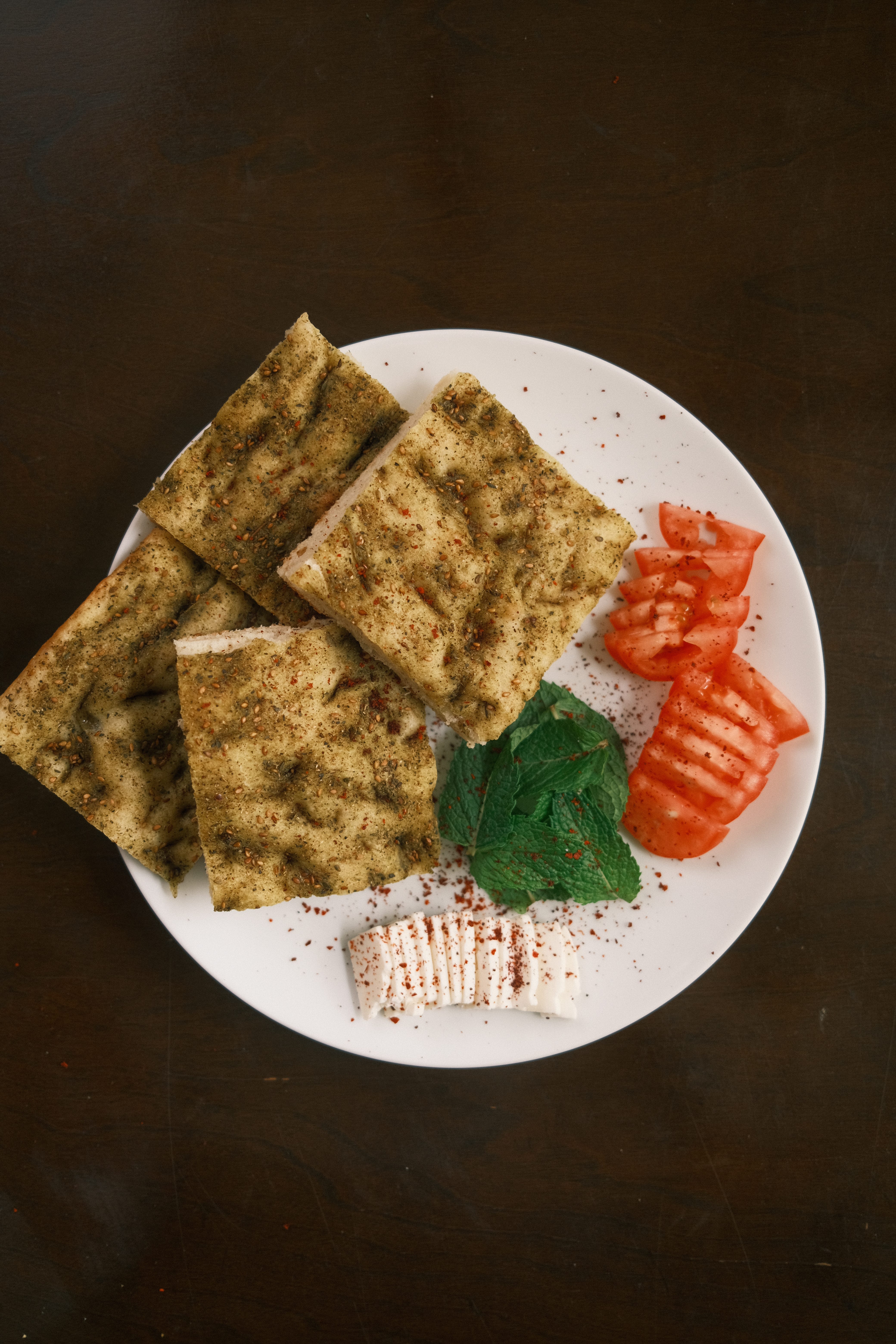 Remove and let it cool for a few minutes then slice and enjoy. I am serving with Akkawi cheese, tomatoes, and mint. And of course some extra za’atar and olive oil.